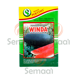 Semangka Hibrida F1 WINDA. Cocok ditanam pada dataran rendah hingga menengah. Dapat dipanen mulai umur 58 - 60 HST. Bentuk buah oblong warna hijau tua kehitaman. Ukuran buah panjang 20 - 23 cm, diameter 13.4 - 14.8 cm. Warna daging buah merah dengan tekstur buah renyah. Rasa manis dengan kadar gula 10.3 - 11.3°brix. Berat buah dapat mencapai 3.5 - 4 kg/buah (Bila dibesarkan lebih dari dua buah/tanaman, berat buah mencapai 2.0 - 2.5 kg/tanaman). Kebutuhan benih 265 gram/ha. Jarak tanam anjuran 60 x 50 cm.